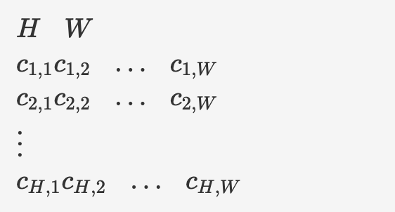 Сітка розмірності \(H × W\) містить печиво у комірках. Колір печива в \(i\)-му рядку зверху та \(j\)-му стовпці зліва позначається малою англійською літерою \(c_{i,j}\) .